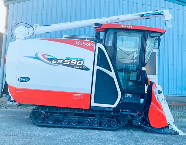 クボタのコンバインは「ER590」高馬力、高精度の5条刈りモデルで、中古市場でも安定した需要があります。